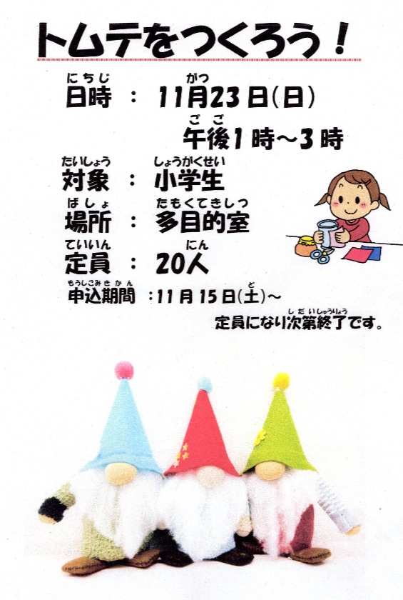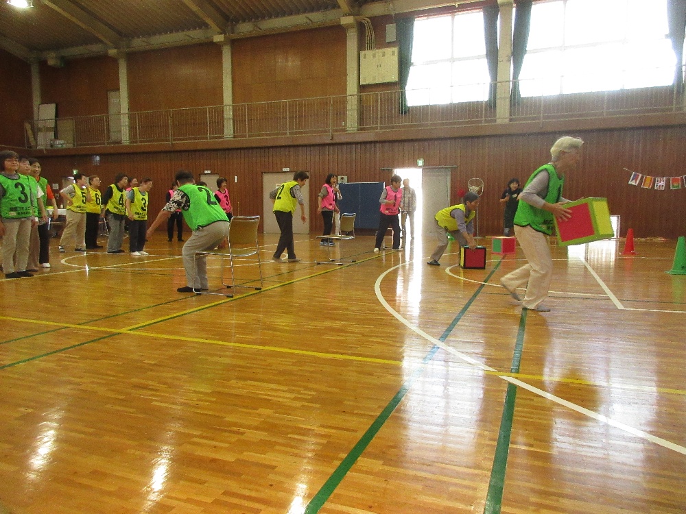 10月19日(日)午後1時から多目的室と体育室にて「あきまつり」を開催しました。小学生、幼児とその保護者など36名が参加しゲームやくじ引き、お店屋さんなどを楽しみ、体育室では作った竹とんぼを飛ばして遊ぶなど楽しいひとときをすごしました。