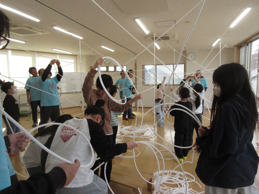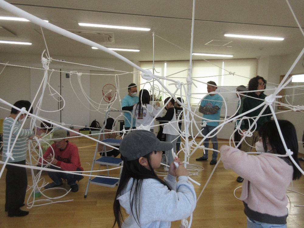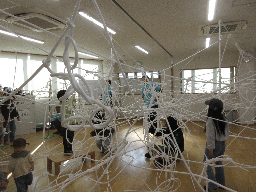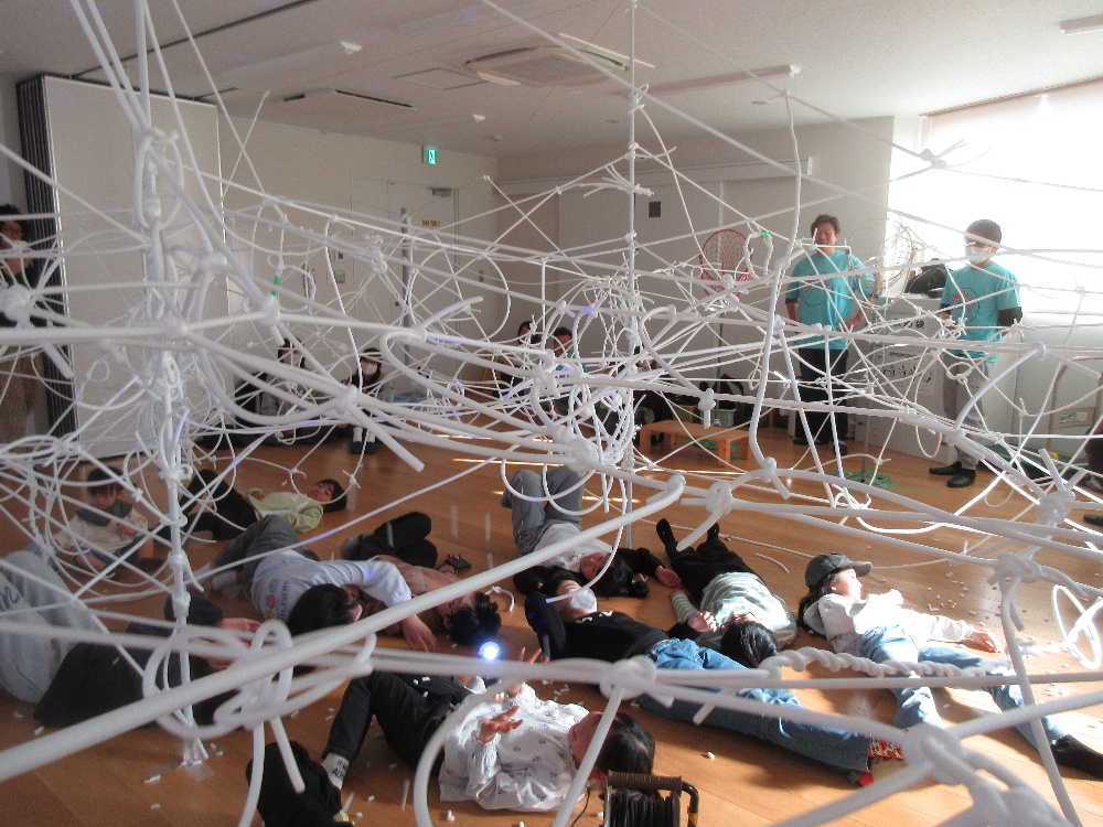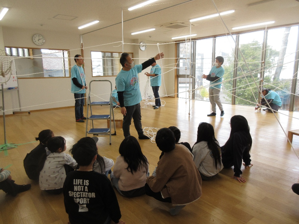 2月15日(日)「日曜日のパパたちといっしょにあそぼう!」(まちのこクラブ行事)を開催しました。小学生を対象に日曜日のパパたちといっしょに部屋の中に糸をクモの巣のようにはりめぐらし、不思議な空間を楽しみました。