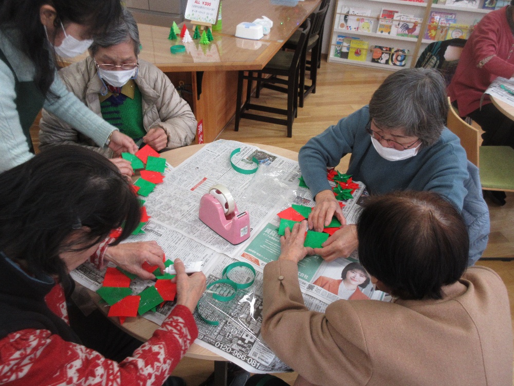 | 内容 | 演歌体操などを通じ健康増進へお役立ていただけます。 12月11日(木)はクリスマスオーナメントづくりを楽しみました。(写真) |